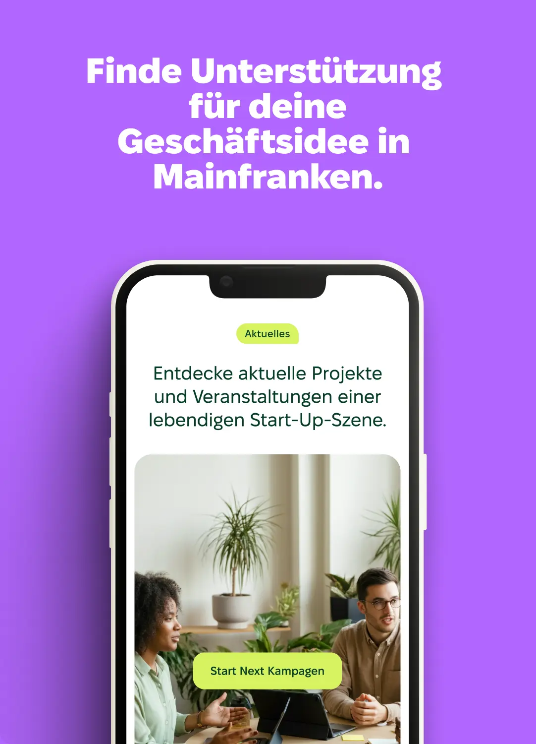 Damit dieser Neuanfang von Beginn an sein volles Potenzial frei entfalten kann, haben wir dem Zusammenschluss nicht nur eine digitale Heimat gegeben, sondern gleich einen frischen Markenauftritt verpasst. Eine visuelle Gestaltung mit strahlenden Farben vermittelt Positivität und Optimismus, während der stilisierte Avatar im Signet, den Gründer:innen fokussierten Ansatz aufgreift. Die von uns gestalteten und umgesetzten Werbeassets und Landingpage kombinieren das neue Corporate Design mit einer klaren Struktur, sodass Informationen zu Maßnahmen aus ganz Mainfranken einfach zugänglich werden. So werden aus über 12 Partner:innen eine zentrale Anlaufstelle für Gründer:innen in der Region und aus der Webseite ein Hub für Informationen und Vernetzung.